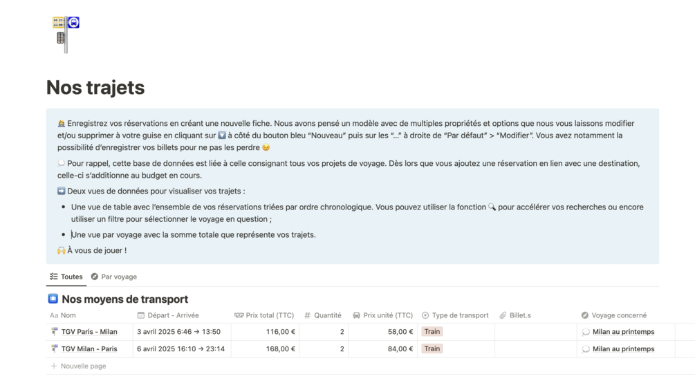 🔥 Pages réservations : liez toutes vos réservations à votre projet de voyage : hébergement, transports et activités.